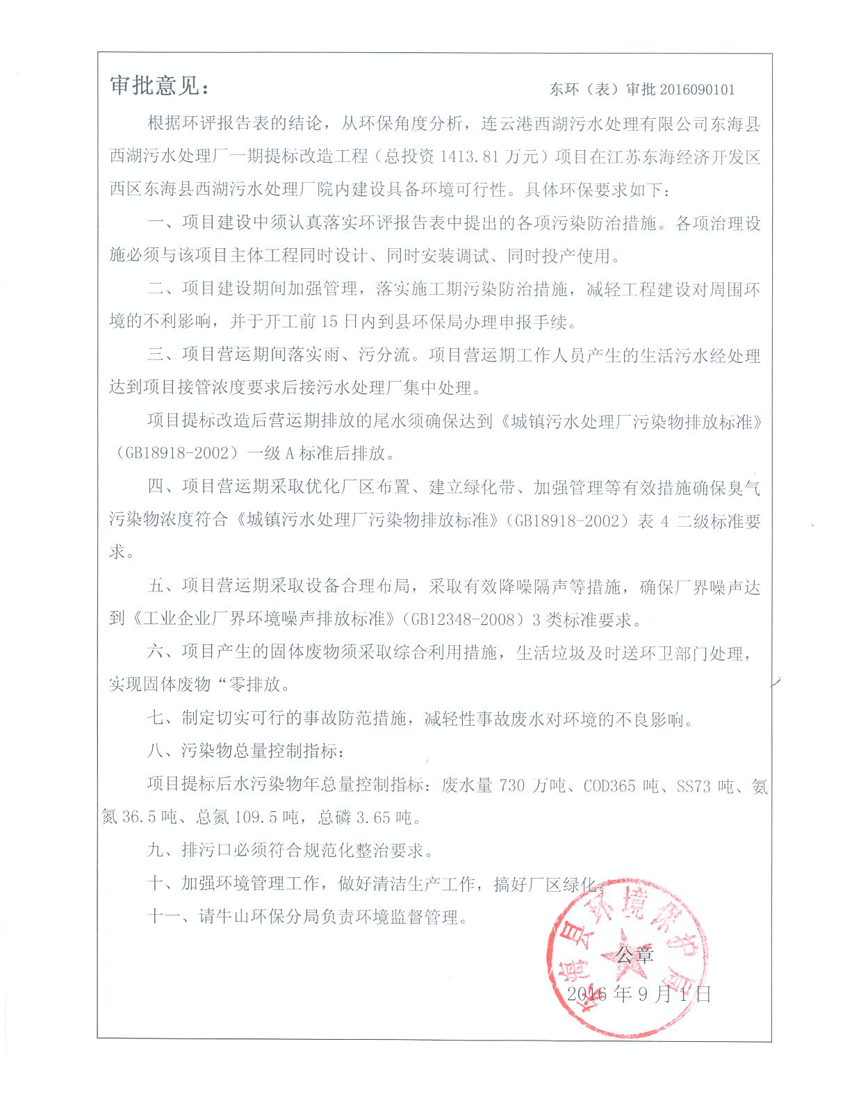 东海县西湖污水处理厂一期规模日处理为2万立方米, 2006年6月18日建成投产,2006年12月5日通过市环保局三同时验收。污水收集范围为东海县城自水晶公园以西、玉带河以南、徐海路以北的主城区三分之二的生活污水及西开发区部分达到接管标准企业的工业废水。一期提标改造工程于2017年7月份开工建设。提标后出水水质由原来执行DB32/180-1998连云港地方二级标准提升至《城镇污水处理厂污染物排放标准》(GB18918-2002)一级 A标准。一期提标改造工程于2017年12月28日通过工程竣工验收,2018年2月8日通过环保“三同时”验收。